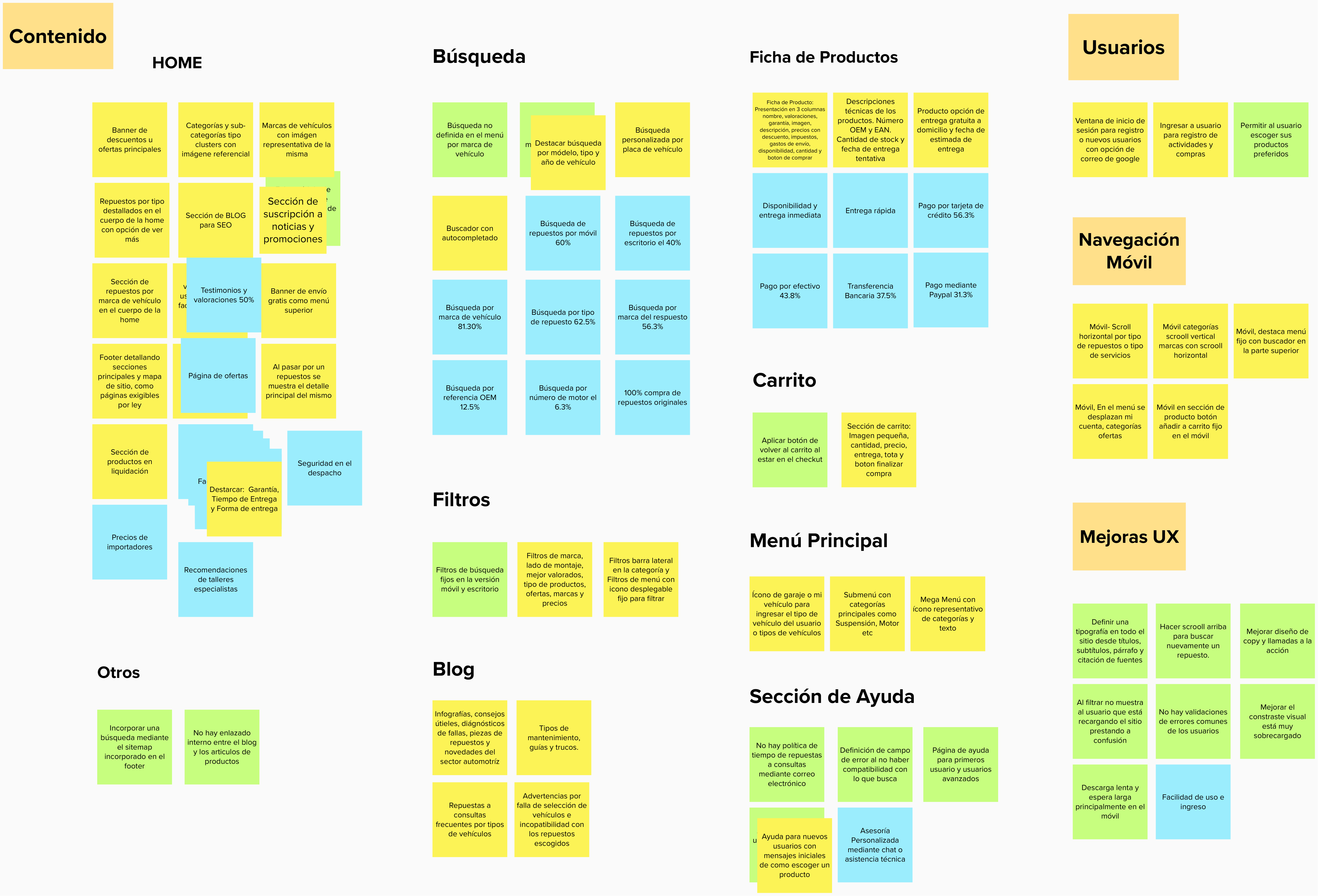 Con esta técnica mediante post agrupamos la información obtenida durante todo el proceso de investigación de forma visual, clasificando por áreas las partes del proyecto a mejorar o proponer nuevas funcionalidades acorde a las necesidades del usuario.
