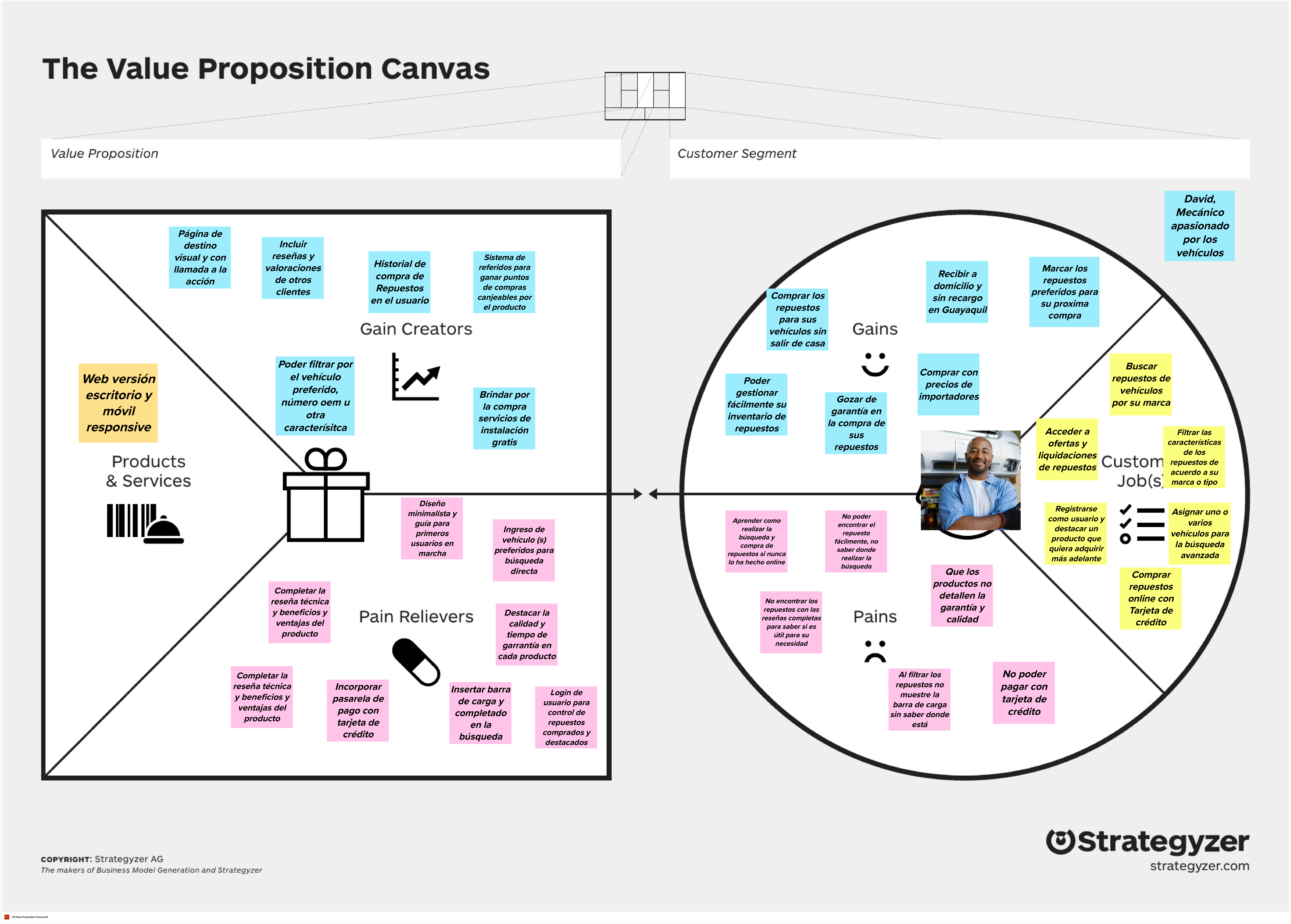 El Value Proposition Canvas nos permitió redefinir o pulir nuestra propuesta de valor y las nuevas funcionalidades de nuestro producto, en donde definimos las actividades del usuario en el producto, puntos de dolor y la forma de contrarestrar estos, así como los productos y servicios mínimos que podremos ofrecer para satisfacer las necesidades del usuario.