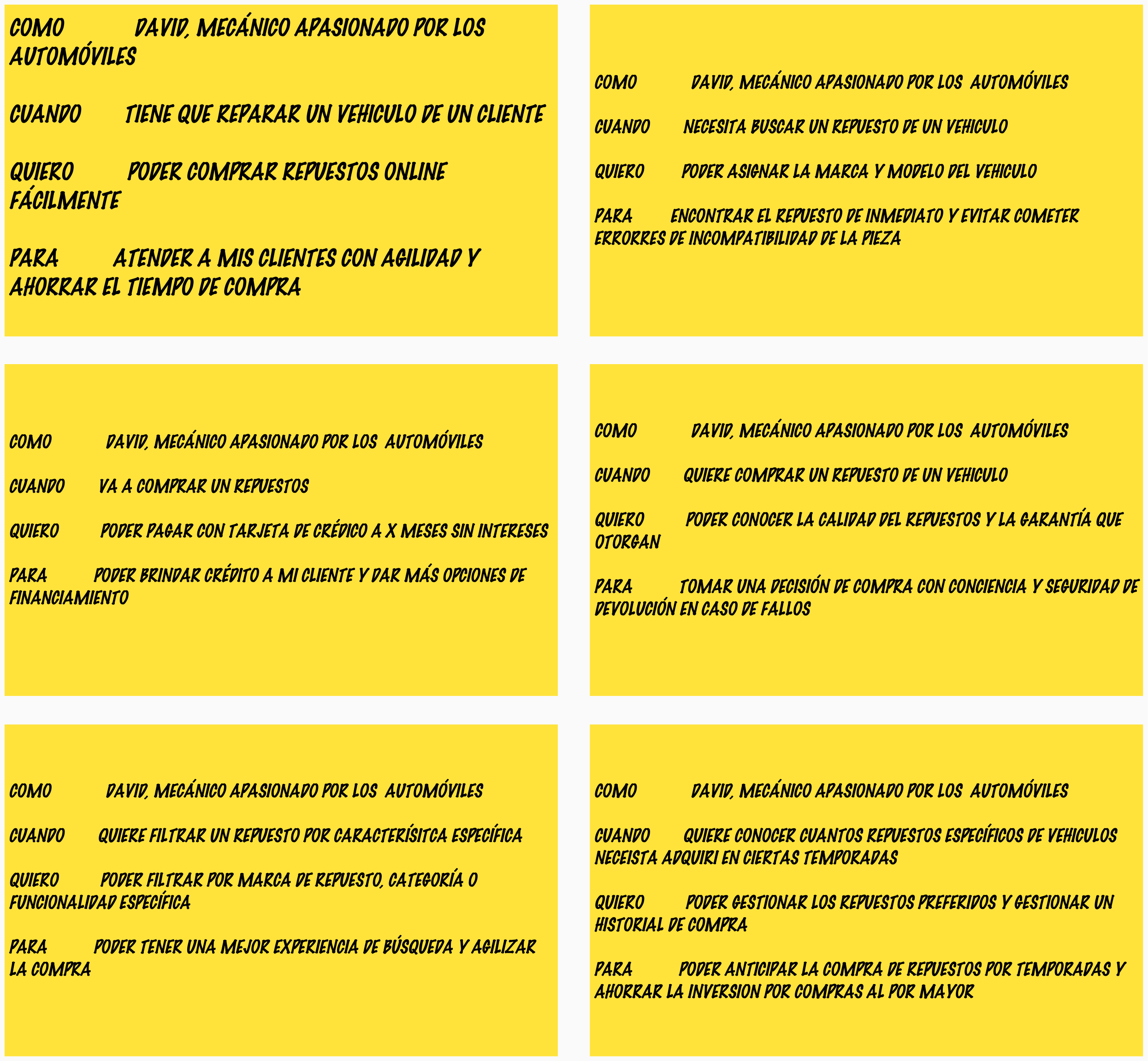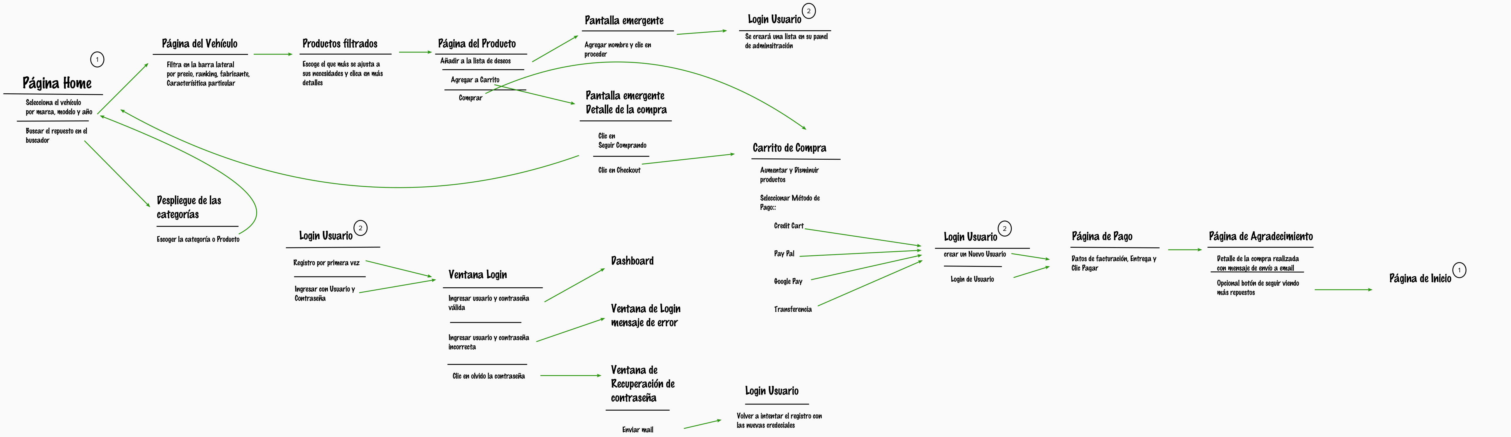 Definimos los pasos que el usuario o user persona debe cumplir para realizar la compra de un repuesto, reflejando su comportamiento y espectativas, incluyendo sus posibles emociones al interactuar con el sitio web, este nos permitió ver que punto de dolor son los que le impiden tener una mejor experiencia con el sitio web.